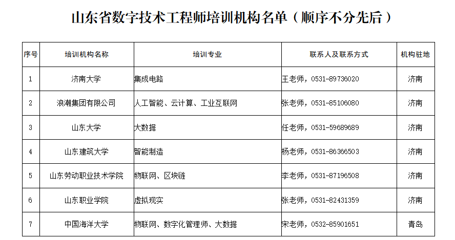 1.做好项目招生。各区县人力资源社会保障部门应结合本辖区数字技术人才培育需求,制定数字技术工程师年度培训计划,主动与我省数字技术工程师培训机构对接沟通,共同做好培育项目的招生和组织实施。应拓展数字技术工程师培育项目招生方式,鼓励面向先进制造业企业、数字化转型企业、高校毕业生等重点行业、重点企业、重点群体开设定制化培训班,提升培育项目的针对性和实效性。山东省数字技术工程师培训机构名单及联系方式见附件。